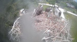 “I live right down the street from where this nest is. I drove through on Friday morning and saw two osprey in the trees just outside the nest. So the mom/dad/ fledgling (couldn’t tell who was who) are near the nest just out of the camera view.”