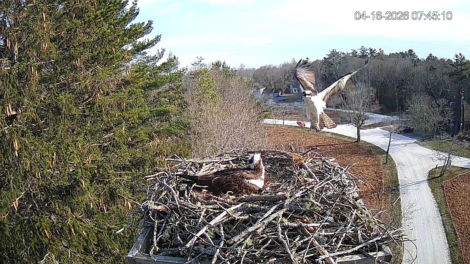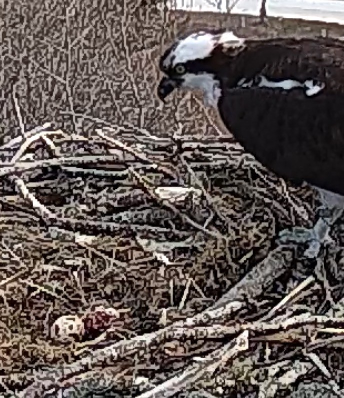 I saw both of the ospreys at the nest one flew off the other one was looking down towards the crevice in the nest. I think the egg lodged in that crevice. Now both flew off. I hope I’m wrong.